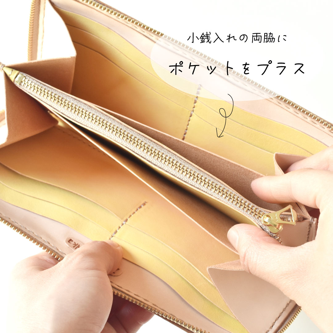 今回はカードポケットの裏側に一つ、 小銭入れの両サイドにポケットを一つずつ追加しました。